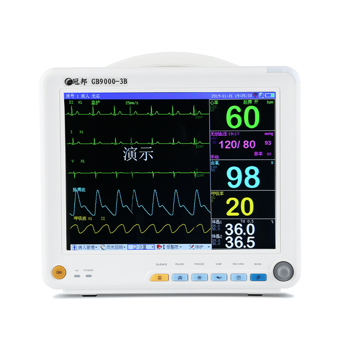 多參數監護儀能為醫學臨床診斷提供重要的病人信息,通過各種功能模塊,可實時檢測人體的心電信號、心率、血氧飽和度、血壓、呼吸頻率和體溫等重要參數,實現對各參數的監督報警。信息存儲和傳輸,是一種監護病人的重要設備。GB9000-3A多參數監護儀適用于兒童和成人監護,可監測參數:心電、血氧飽和度、無創血壓、呼吸、體溫。